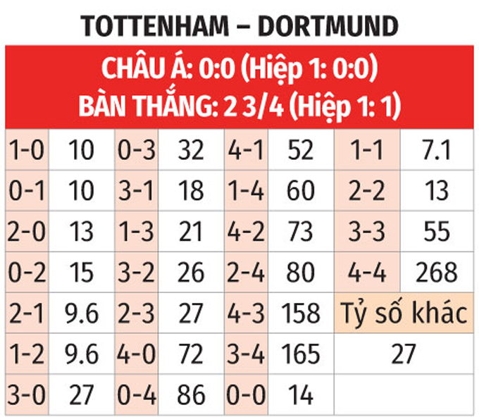 - Hai đội cùng ghi bàn: Tottenham thành công trong việc ghi bàn ở 6/7 trận gần nhất còn với Dortmund là ở 7 trận liên tiếp vừa qua. Bên cạnh đó, Tottenham ghi bàn ở 9 trận liền trên sân nhà vừa qua còn với Dortmund là ở 10 trận liên tiếp trên sân khách gần đây. Với xu hướng như vậy, khả năng cao hai đội sẽ cùng tìm được đường vào khung thành của nhau.