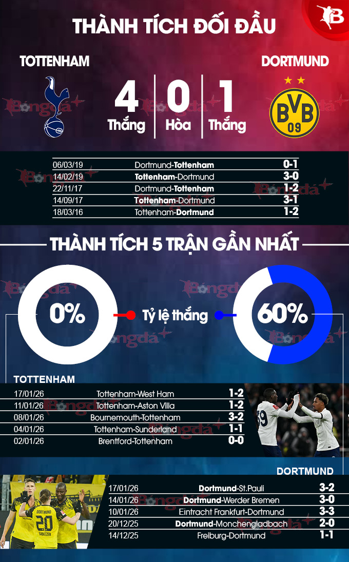 Vào thời điểm khó khăn này, Tottenham lại phải gặp một Dortmund đang vào phom. CLB này vừa có thắng lợi 3-2 trước St.Pauli để gia cố vị trí thứ 2 trên BXH Bundesliga. Lúc này, Dortmund đang có mạch 7 trận liền không thua. Ngay cả trên sân khách, họ cũng chỉ có 1 lần thất bại ở 8 trận gần nhất.