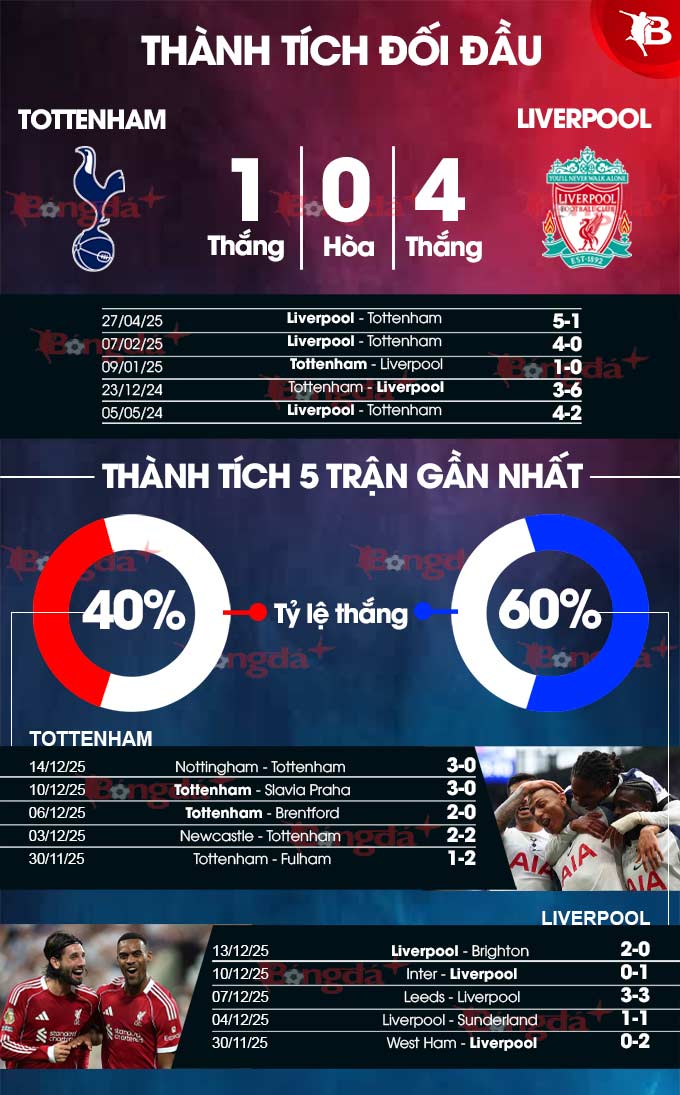 - Lưới rung 15 phút cuối: 3/4 trận gần đây của Tottenham xuất hiện bàn thắng trong khoảng 15 phút cuối. 6/7 trận đấu vừa qua của Liverpool xảy ra tình trạng tương tự.