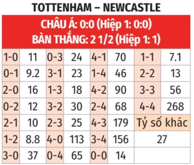- Tối thiểu 1 bàn hiệp 1: 13/14 lần đối đầu giữa 2 đội gần đây tại các giải chính thức đều có từ 1 bàn thắng trở lên trong hiệp 1. Tình trạng tương tự xảy ra ở 7 trận gần đây của Tottenham và 6 trận mới nhất của Newcastle.