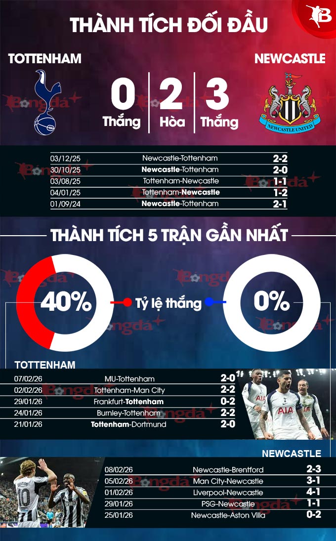 Tuy nhiên, Newcastle vẫn có lý do để tin tưởng có thể rời London với 3 điểm. Thứ nhất, họ có sự ủng hộ của quá khứ. Theo quan sát, trong 8 lần đối đầu giữa 2 đội vừa qua, Chích chòe thắng 6, hòa 1, chỉ phải nhận 1 thất bại. Trong đó, ở lần gần nhất ghé thắng nhà của Tottenham, Newcastle giành chiến thắng 2-1.