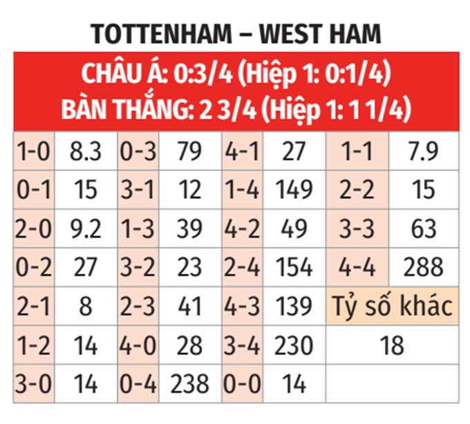 - Tối thiểu 3 bàn: 3/4 trận sân nhà gần đây của Tottenham đều có tối thiểu 3 bàn. 3/4 trận vừa qua của West Ham số lần lưới rung cũng đều cao hơn ngưỡng 2.