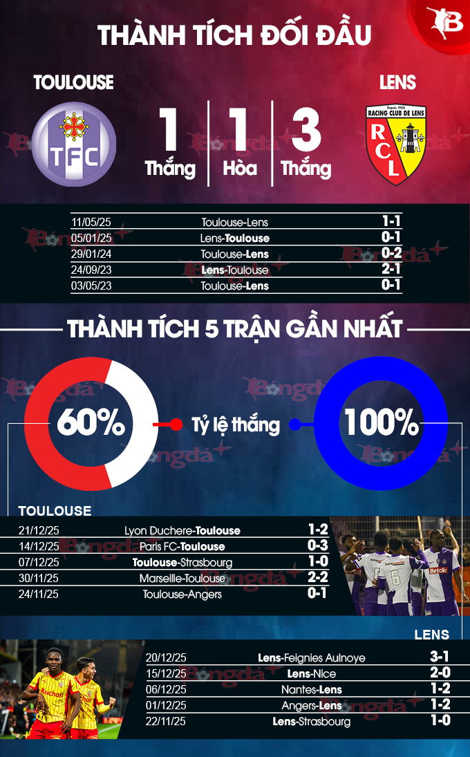 - Hai đội cùng ghi bàn: Toulouse ghi ít nhất 1 bàn ở 6/7 trận gần nhất, ở 13/15 trận sân nhà vừa qua. Còn 7/10 trận gần đây của Lens đều chứng kiến mỗi đội ghi được ít nhất 1 bàn thắng. Hơn nữa, 10/13 chuyến làm khác gần nhất đều khép lại mà không đội nào giữ sạch lưới nhà.