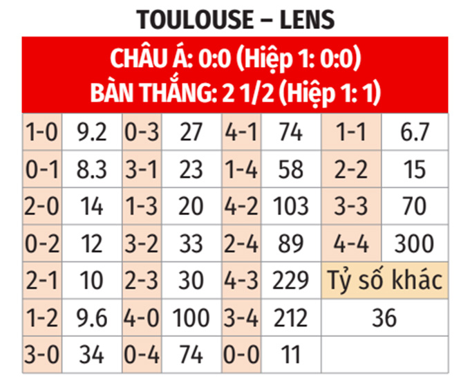 - Từ 3 bàn trở lên: 3/4 trận gần nhất của Toulouse và 5/7 trận vừa qua của Lens đều có tối thiểu 3 bàn cả trận. Hơn nữa, 7/10 chuyến xa nhà vừa qua của Lens cũng có ít nhất 3 bàn cả trận.