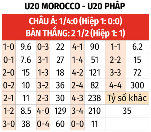 - Từ 3 bàn trở lên: 3/4 trận gần đây của U20 Morocco cùng 4/5 trận vừa qua của U20 Pháp đều có ít nhất 3 bàn thắng. 2 trận đối đầu gần nhất thậm chí có tối thiểu... 7 bàn thắng.