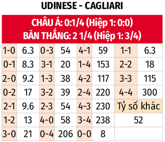 - Udinese thắng theo châu Á: Đội chủ nhà thắng theo châu Á 3/5 trận gần đây, trong khi Cagliari để thua theo châu Á 5/8 trận sân khách vừa qua tại đấu trường Serie A. Chưa kể, lịch sử chứng kiến Udinese toàn thắng 2 trận đối đầu mùa trước theo cả chuyên môn và thành tích châu Á.