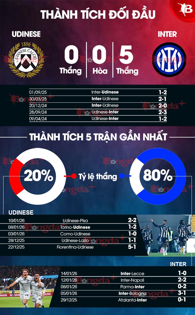 Inter đã ghi 27 bàn vào lưới Udinese trong 11 lần chạm trán gần nhất giữa đôi bên. Trong số này có 9 trận Inter ghi tối thiểu 2 bàn và không trận nào Udinese có thể giữ sạch lưới.