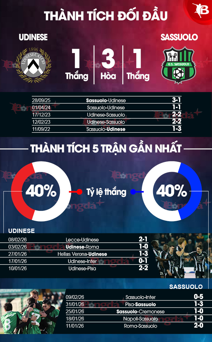 Tiếp đó, 6 lần gần nhất khi Udinese tiếp Sassuolo trên sân nhà, họ thắng 3 và hòa 3. Do vậy, nhiều khả năng, Udinese sẽ có thắng lợi trước Sassuolo.