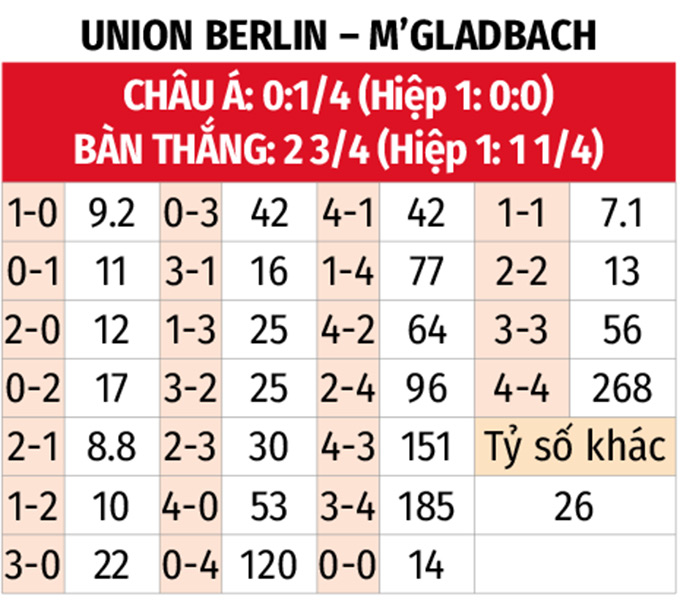 - M'gladbach thắng theo châu Á: Union Berlin để thua theo châu Á 4/5 trận chính thức gần đây, đồng thời thua cả 2 trận đối đầu gần nhất. Đáng chú ý, trận sân nhà gần nhất Union Berlin cũng nhường M'gladbach 1/4 trái và để thua.