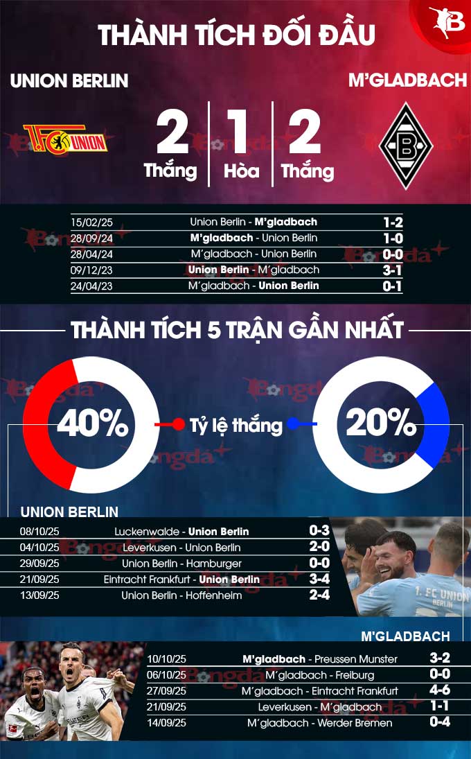 M'gladbach bước vào trận đấu cuối tuần này với 3 trận hòa và 3 thất bại sau 6 trận đã đấu. Với 3 điểm, đội khách hiện đứng áp chót trên BXH, bằng điểm đội bét bảng Heidenheim và kém chính Union Berlin 3 điểm. Màn so T giữa đôi bên bởi thế mang tính chất rất quan trọng, ảnh hưởng đến cuộc chiến thoát khỏi khu vực cầm đèn đỏ.