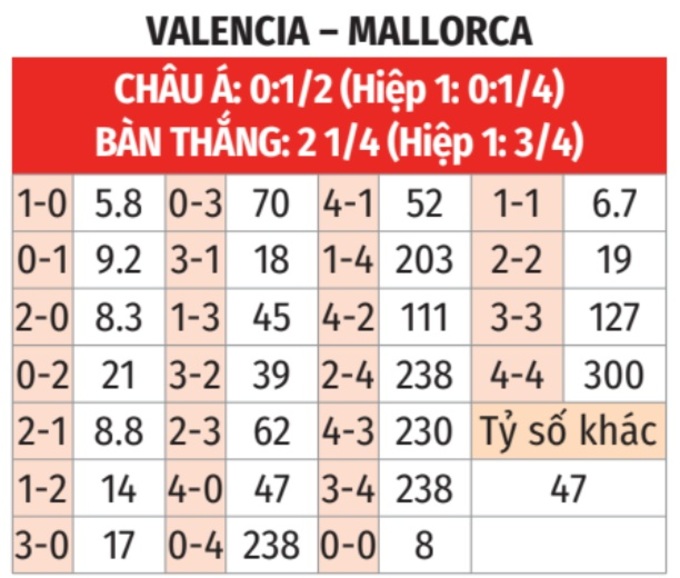 - Tối đa 2 bàn: 4/5 lần gặp giữa 2 đội gần đây chỉ có nhiều nhất 2 bàn thắng. 6/7 trận gần đây của Valencia chỉ có 2 bàn thắng đổ lại. 2 trận sân khách vừa qua của Mallorca xảy ra tình trạng tương tự.
