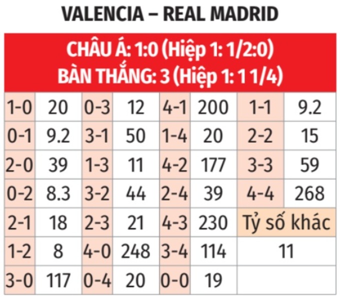 - Tối đa 1 bàn hiệp 1: 3/4 lần gặp giữa 2 đội gần đây trên sân của Valencia đều chỉ có nhiều nhất 1 bàn thắng trong hiệp 1. Tình trạng tương tự xảy ra ở 10/11 trận gần đây của Valencia ở La Liga và 7 trận gần nhất của Real Madrid cũng ở La Liga.