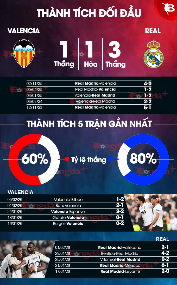 Valencia không xứng tầm đối thủ với Real Madrid. Bằng chứng là trong 10 cuộc đụng độ gần đây giữa 2 đội, đội bóng thủ đô Madrid áp đảo. Cụ thể, họ 7 lần đánh bại Bầy Dơi, hòa 1 trận và chỉ 2 lần phải bại dưới tay của Valencia. Riêng ở trận lượt đi tại La Liga mùa này, đội chủ sân Bernabeu vùi dập Valencia 4 bàn không gỡ, trong ngày tiền đạo Kylian Mbappe lập “cú đúp” bàn thắng.