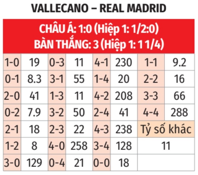 - Tối thiểu 2 bàn hiệp 1: 3 lần đụng độ giữa hai đội gần đây đều có từ 2 bàn thắng trở lên trong hiệp 1. 3/4 trận sân khách gần đây của Real Madrid ở La Liga và 4/6 trận vừa qua của Vallecano xảy ra tình trạng tương tự.
