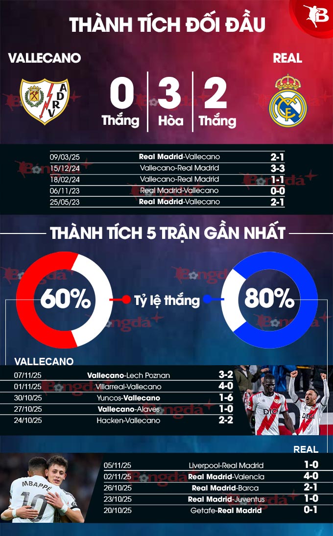 Chưa kể, Real Madrid còn có sự ủng hộ của lịch sử. Thống kê cho thấy, đội bóng thủ đô Madrid áp đảo Vallecano trong các cuộc đối đầu trong quá khứ. Cụ thể, trong 25 cuộc đụng độ giữa hai đội gần đây, Real Madrid thắng 19 trận, hòa 3, chỉ phải nhận 3 thất bại.