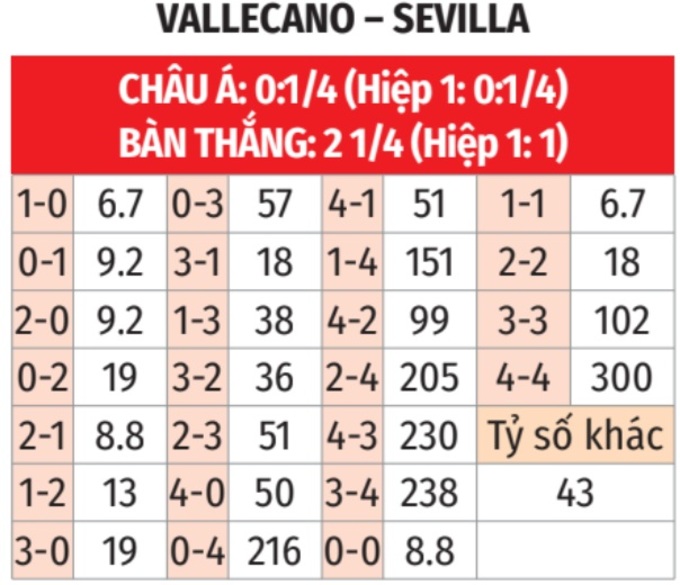 - Chẵn bàn thắng: 3/4 lần đối đầu giữa 2 đội gần đây trên sân của Vallecano kết thúc chẵn bàn thắng. Tình trạng tương tự xảy ra ở 4/5 trận gần đây của Vallecano và 4/6 trận sân khách mới nhất của Sevilla.