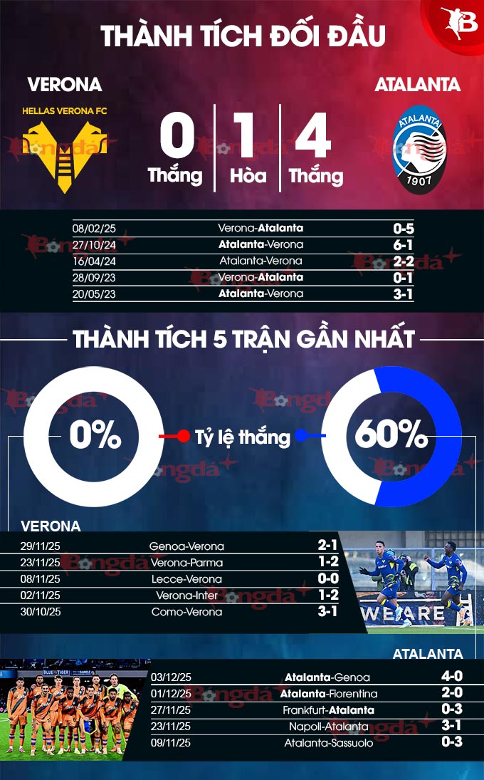 Verona có lợi thế sân nhà nhưng không thắng tại đây kể từ khi mùa giải mới khởi tranh. Ngoài ra, Atalanta lại vượt trội về nhiều mặt, bao gồm cả đối đầu trực tiếp khi thắng 7/9 lần so T gần nhất. Nhiều khả năng, trận đấu này sẽ kết thúc với thắng lợi cho Atalanta.
