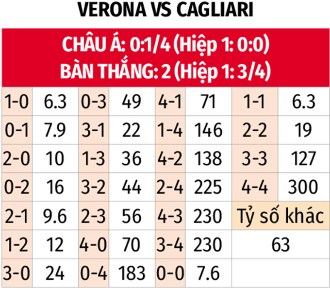 - Cagliari thắng theo châu Á: Verona bước vào trận đấu này với thành tích chỉ thắng 1/7 trận, trong đó có 3 thất bại và 3 trận hòa. Với Cagliari, đội bóng này toàn thắng châu Á 3 trận liên tiếp cùng 2 trận đối đầu gần nhất.