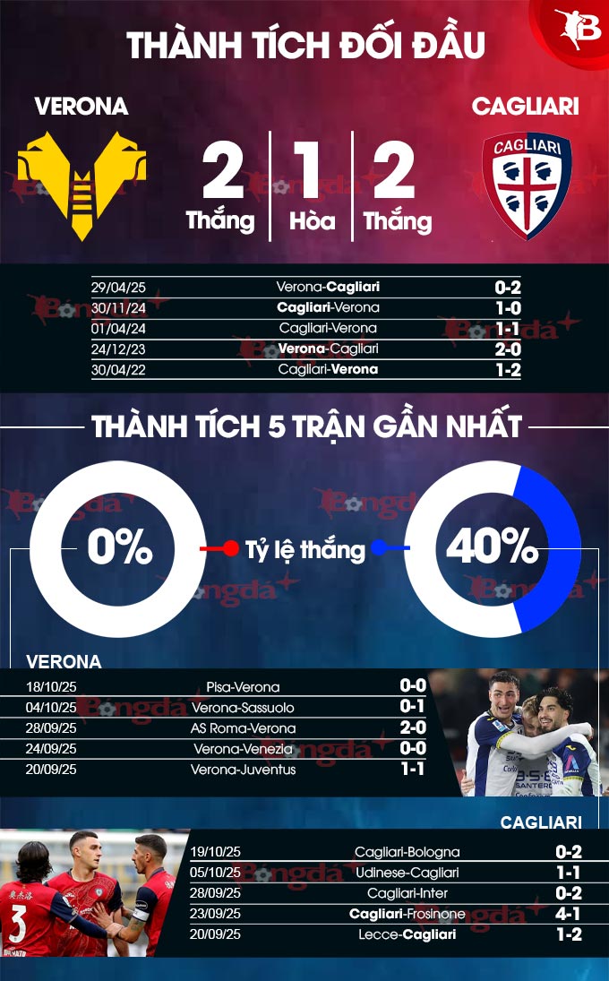 Cả Verona và Cagliari đều không có phong độ tốt trước màn so T cuối tuần này, nhưng đội chủ nhà đang gặp khó khăn đáng kể hơn. Đoàn quân của HLV Paolo Zanetti là đội ghi ít bàn thắng nhất giải đấu với chỉ 2 bàn sau 7 trận, nằm trong nhóm bốn đội (cùng Fiorentina, Genoa và Pisa) chưa biết đến mùi chiến thắng tính tới trước vòng đấu thứ 8.