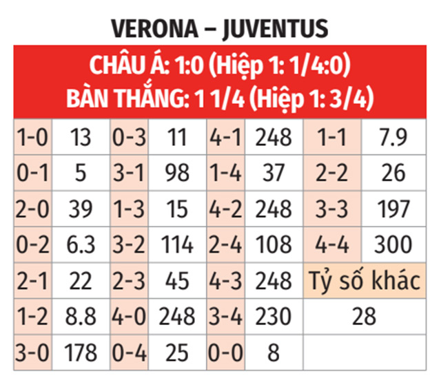 - Chủ nhà thua theo châu á: Trong khi Verona mới thua kèo 5/6 trận gần đây thì Juventus lại thắng kèo ở 4/5 trận gần nhất. Khi các vị khách có duyên như vậy, đứng về phía họ là giải pháp khá an toàn.