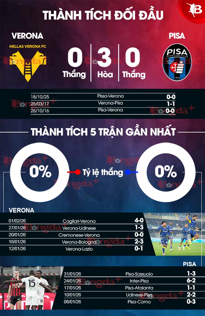 Ở trận này, Verona tuy có lợi thế sân nhà nhưng họ cũng chỉ thắng 1/10 trận vừa qua. Chiều ngược lại, Pisa không có niềm vui ở 10 trận vừa xong trên sân khách.