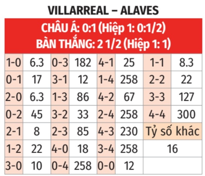 - Tối thiểu 5 góc hiệp 1: 5/6 trận đấu gần đây của Villarreal đều có từ 5 quả phạt góc trở lên ở hiệp 1. Tình trạng tương tự xảy ra ở 3/4 trận vừa qua của Alaves.