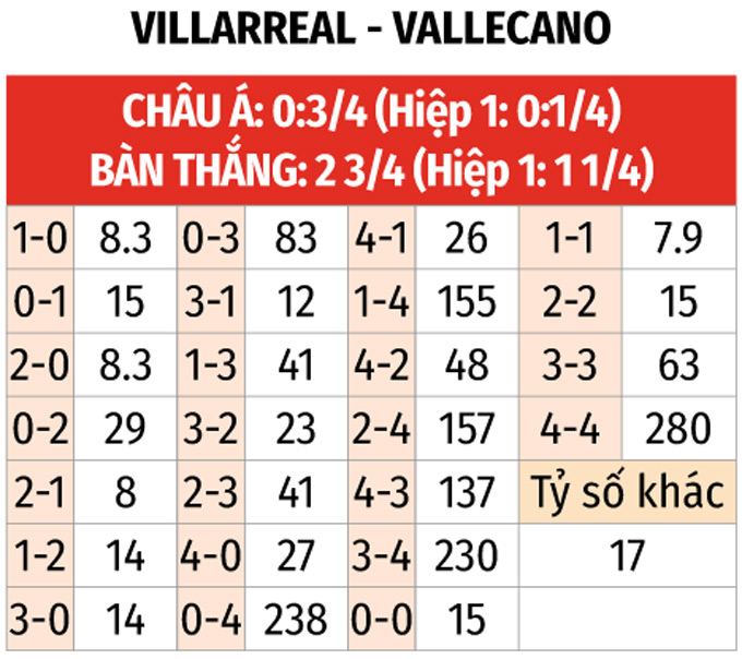 - Tối đa 4 góc hiệp 1: 6 trận liên tiếp của Villarreal đều khép lại 45 phút đầu tiên với tối đa 4 quả đá phạt góc trong hiệp đầu tiên. Lịch sử đối đầu cũng chứng kiến 3/4 trận gặp nhau gần nhất giữa đôi bên có tối đa 4 góc trước giờ nghỉ.