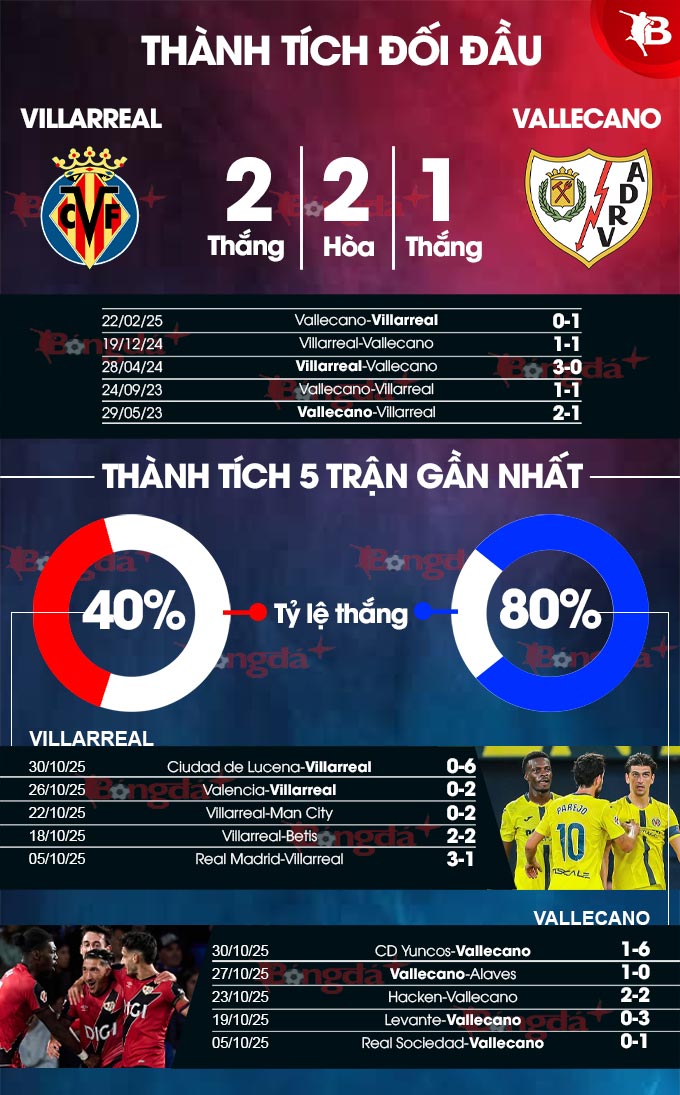 Tàu ngầm vàng hy vọng sẽ cạnh tranh cho một vị trí trong Top 4 tại La Liga mùa giải này và họ sẽ hướng tới chiến thắng thứ 7 trước khi đối đầu Pafos tại Champions League vào tuần tới. Villarreal đã thắng 17 trong số 33 trận đấu trước đó với Vallecano trên mọi đấu trường, bao gồm cả chiến thắng 1-0 khi hai đội chạm trán nhau lần cuối tại Madrid vào tháng 2.
