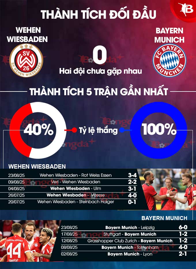- X cả trận: 5/6 trận gần nhất của Wehen Wiesbaden và 5/6 trận vừa qua của Bayern Munich đều có không quá 4 bàn thắng cả trận. Hơn nữa, 6/7 trận sân nhà gần đây của Wehen Wiesbaden và 14/15 chuyến xa nhà vừa qua của Bayern Munich đều chứng kiến tối đa 4 lần lưới rung cả trận.