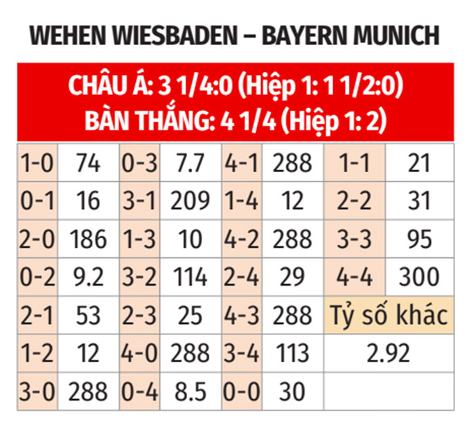 - Lẻ bàn thắng: 5/8 trận gần nhất của Wehen Wiesbaden và 4/6 trận gần đây của Bayern Munich đều có tổng bàn thắng là lẻ. Ngoài ra, 6/9 trận sân nhà vừa qua của Wehen Wiesbaden cũng khép lại với tổng bàn thắng không chia hết cho 2. Trận này khó có ngoại lệ.
