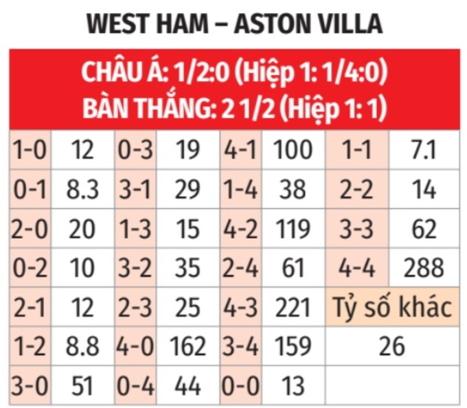 - Tối thiểu 1 bàn hiệp 1: 6 lần đối đầu giữa 2 đội gần đây đều có từ 1 bàn thắng trở lên trong hiệp 1. 8/10 trận sân nhà gần đây của West Ham và 12/13 trận vừa qua của Aston Villa tương tự.
