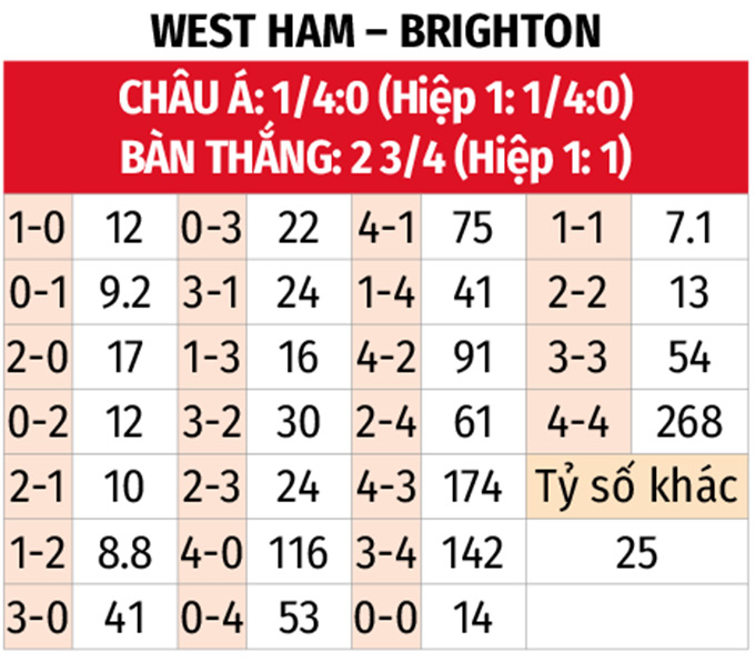 - West Ham thắng theo châu Á: 2 trận đối đầu gần nhất trên sân London, Brighton đều nhường 1/4 trái như trận này và đều bị West Ham cầm hòa. Brighton cũng đang để thua châu Á 4/5 trận vừa qua, bao gồm 1 trận cũng nhường 1/4 trái.