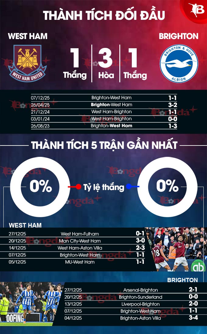 Bên phần sân đối diện, phong độ của Brighton cũng khá thất thường, nhưng nhìn chung vẫn ổn định hơn một chút. Những kết quả gần đây bao gồm trận hòa 1-1 với chính West Ham ở lượt đi hôm 7/12 và những thất bại trước các đội bóng mạnh như Liverpool và Arsenal cuối tuần trước.