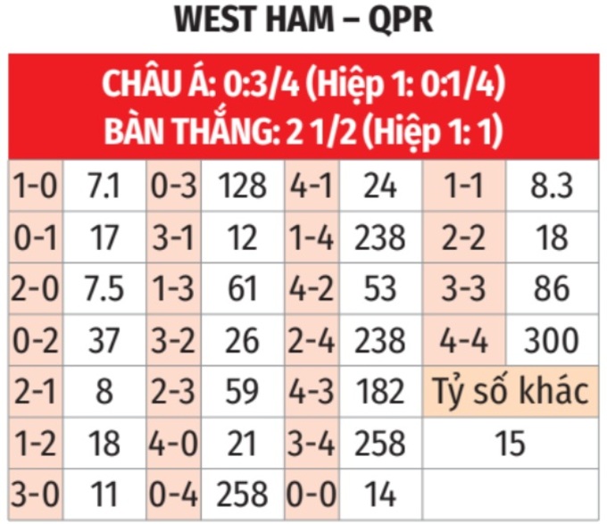 - Lẻ bàn thắng: 5/6 trận đấu gần đây của West Ham kết thúc với tổng số bàn thắng là số lẻ. Tình trạng tương tự xảy ra ở 4/5 trận mới nhất của QPR.