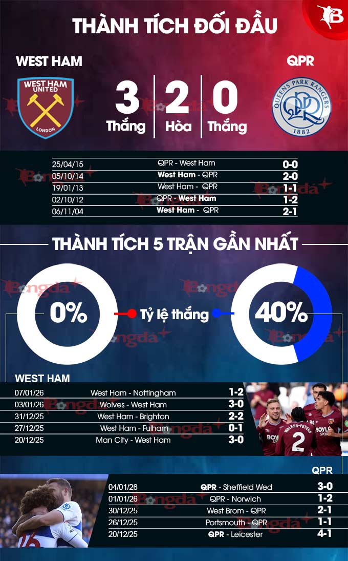 Càng có lý do để đặt niềm tin vào West Ham ở trận này nếu nhìn vào đối đầu giữa 2 đội trong quá khứ. Theo đó, đội bóng thủ đô London bất bại trong 5 lần đụng độ QPR gần đây, bao gồm 3 trận thắng và 2 trận hòa.