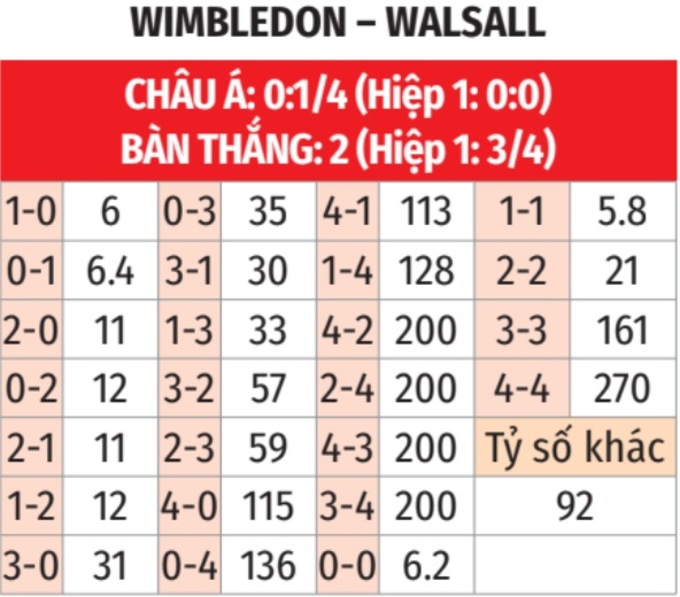 - Lẻ bàn thắng: 4/5 trận đấu gần đây của Wimbledon kết thúc với tổng số bàn thắng là số lẻ. 3/4 trận vừa qua của Walsall cũng có số bàn thắng không thể chia hết cho 2.
