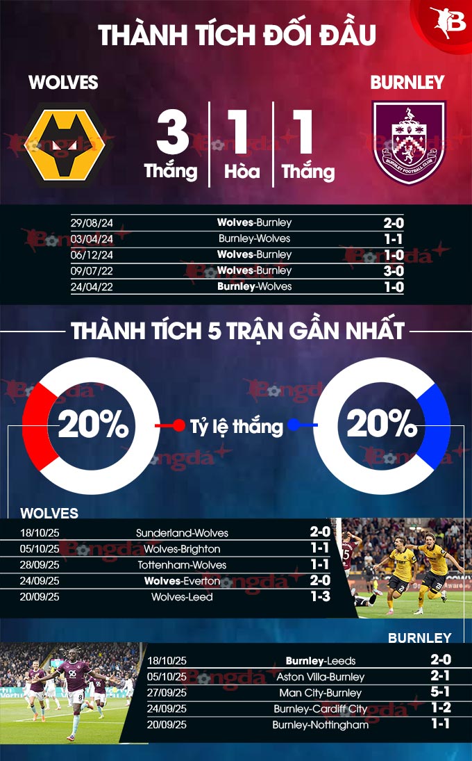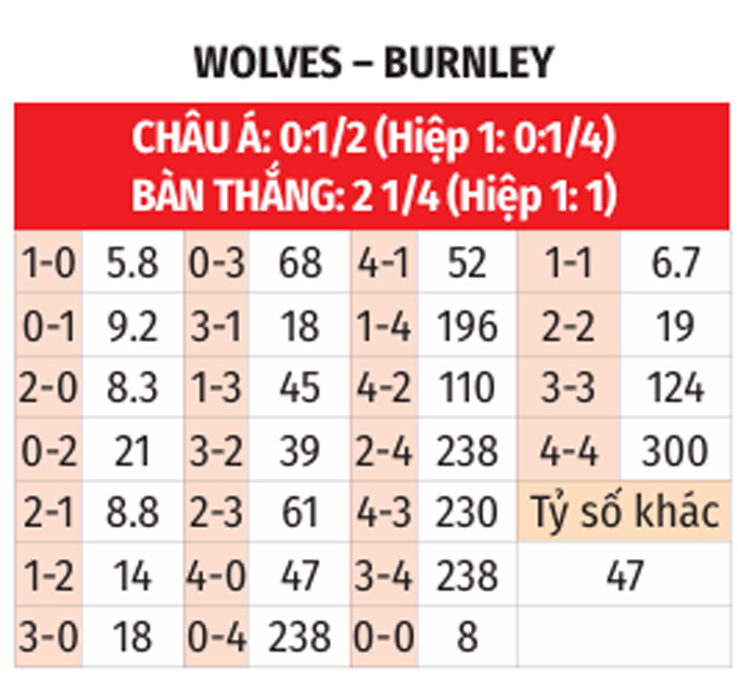 Chiều ngược lại, Burnley toàn thua trên sân khách kể từ khi Ngoại hạng Anh 2025/26 khởi tranh. Chưa hết, thành tích đối đầu giữa 2 CLB gần đây có phần nghiêng về Wolves khi bất bại ở 4 trận so T vừa qua (thắng 3, hòa 1). Do đó, khả năng, Wolves sẽ có niềm vui.