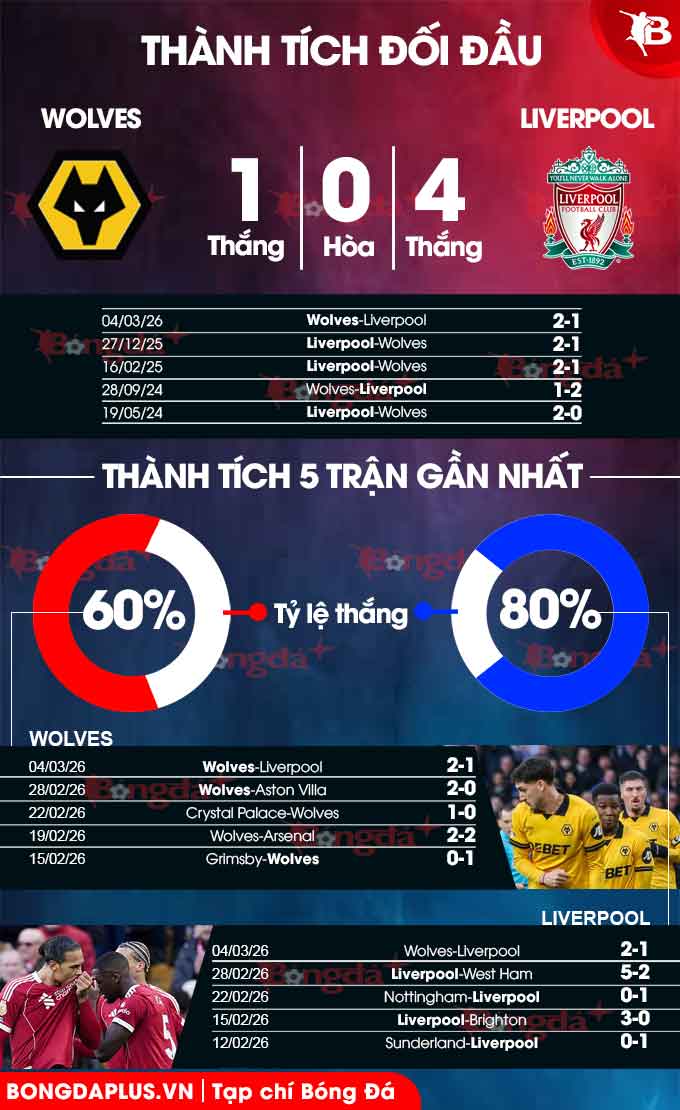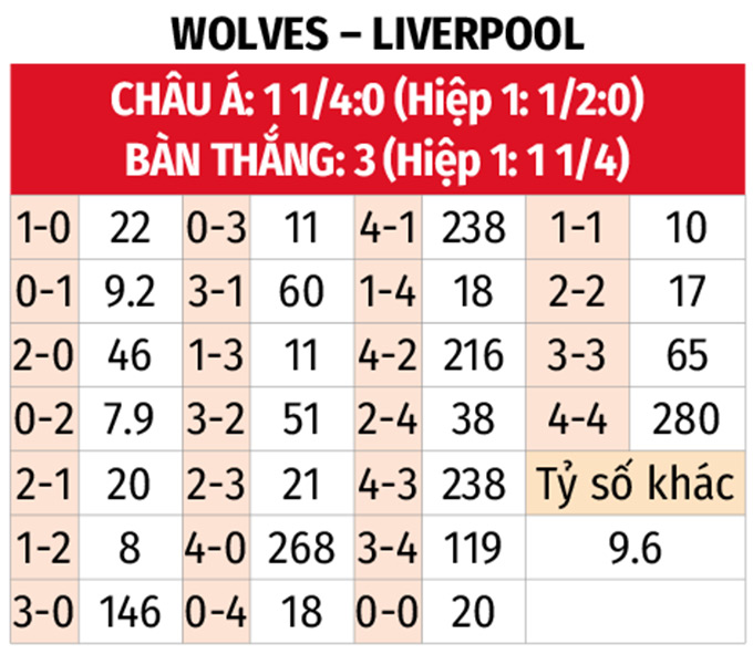 - Từ 3 bàn thắng trở lên: 4 trận đối đầu gần nhất đều có 3 bàn thắng được ghi. 3/4 trận sân nhà gần đây của Wolves cùng 8/10 trận vừa qua của Liverpool cũng có ít nhất 3 pha làm bàn. Có thể chờ tổng bàn thắng về 2 3/4 để cổ vũ mưa bàn thắng.