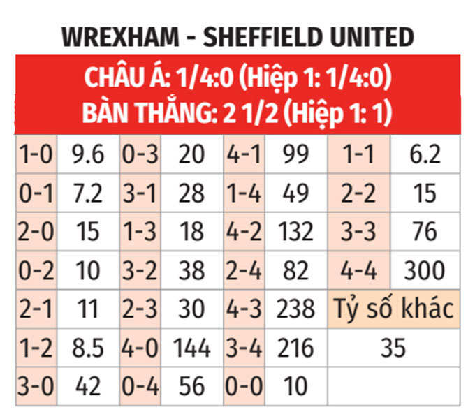 - Wrexham thua theo châu Á: Theo thống kê thì Wrexham đã thua theo châu Á ở 4/5 trận gần nhất. Đá với Sheffield United thắng theo châu Á ở 4/6 trận gần đây, đội chủ nhà không phải là sự lựa chọn đáng tin cậy.