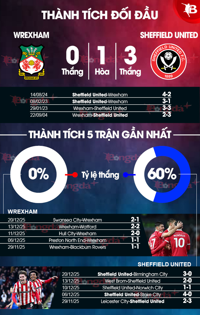Sở dĩ có chuyện như vậy là bởi Sheffield United có phong độ tốt hơn Wrexham. Chẳng thế mà ở 8 vòng đấu gần đây, họ chỉ phải nhận 1 thất bại nhưng lại giành được tới 5 chiến thắng. Mới nhất là màn vùi dập Birmingham City 3 bàn không gỡ.