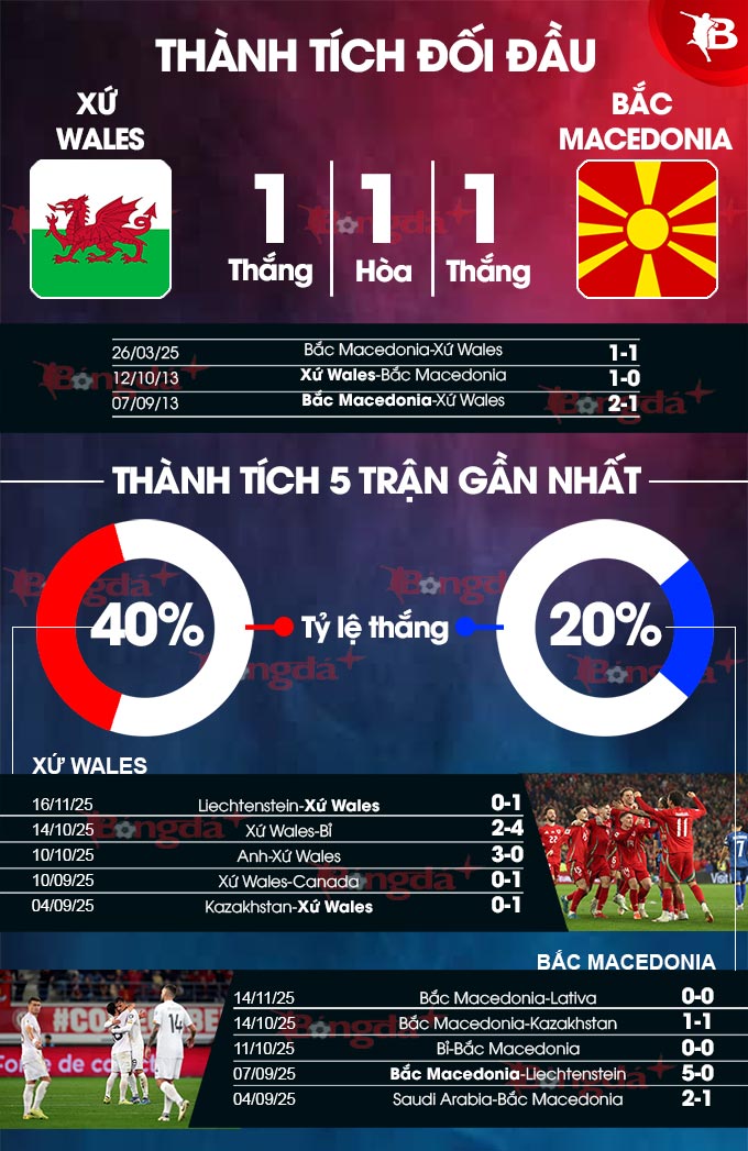 Trong khi Xứ Wales thua 3/5 trận gần nhất thì Bắc Macedonia chỉ thua 1/5 trận vừa xong. Xứ Wales có lợi thế sân nhà và có thành tích tốt khi thắng 4/5 trận vừa xong.