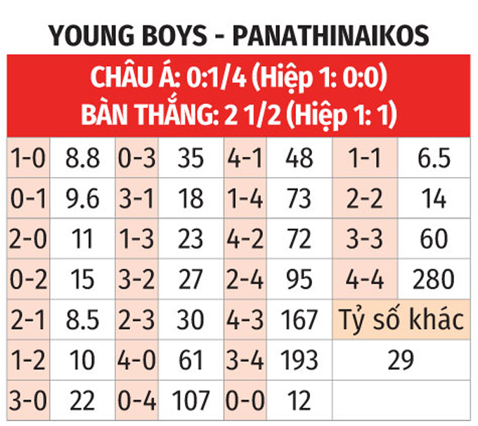 - Lẻ bàn thắng: 5/7 trận gần nhất của Young Boys có tổng bàn thắng không chia hết cho 2. Ngoài ra, 2/3 trận vừa qua Panathinaikos đều chứng kiến điều tương tự.