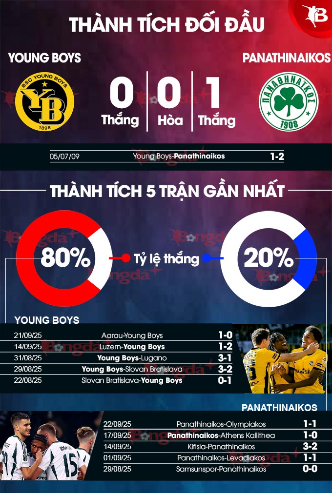 Ngoài ra, Panathinaikos còn chơi rất dở ở sân khách khi chỉ thắng 1/6 trận vừa qua. Còn với Youngs Boys, họ rất mạnh trên sân nhà khi bất bại ở 4 trận mới đây.