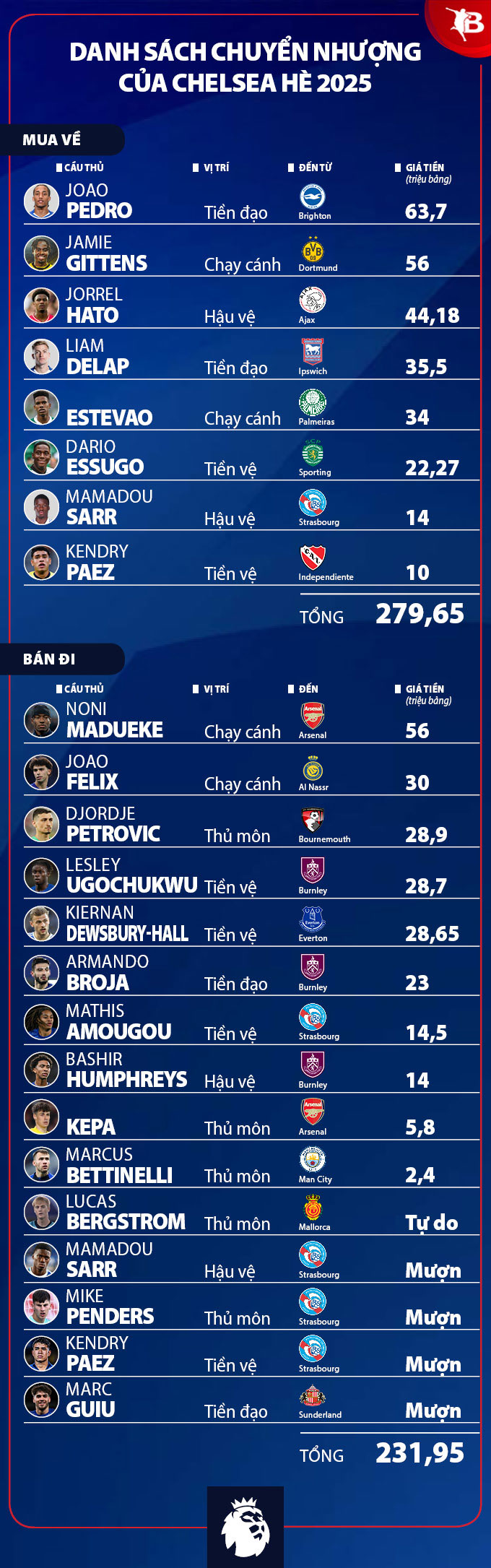 Tổng cộng, Chelsea đã thu về 231,95 triệu bảng tiền thanh lý cầu thủ. Như vậy, chi tiêu ròng của họ chỉ là 47,7 triệu bảng - một con số cho thấy The Blues đang làm rất việc cân bằng thu chi.