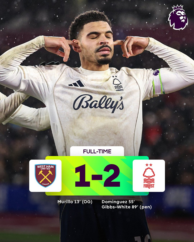 Thảm họa chưa dừng lại. Phút 89, trọng T cho Nottingham Forest hưởng phạt đền, tạo điều kiện để Gibbs-White lập công trên chấm 11m, hoàn tất màn ngược dòng của đội khách.