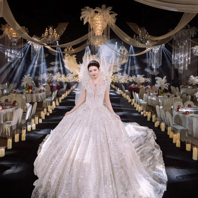 Ở nghi lễ truyền thống, Huang Yaqiong diện bộ trang phục cưới cổ phục cầu kỳ với từng họa tiết thêu nổi bật, điểm xuyết bằng trâm hoa vàng và phụ kiện cài tóc lấp lánh. Sang đến lễ đường phương Tây, nữ VĐV chọn váy cưới trắng đính đá tinh xảo, kết hợp khăn voan dài và vương miện nhỏ.
