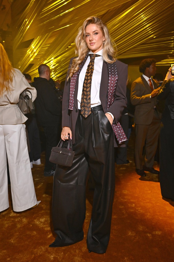 Cô phối nó với một chiếc áo blazer màu nâu, có họa tiết bắt mắt ở lớp lót bên trong. Chưa hết, cô cũng đeo cà vạt trên chiếc áo sơ mi trắng và tạo điểm nhấn bằng một chiếc túi xách đen.