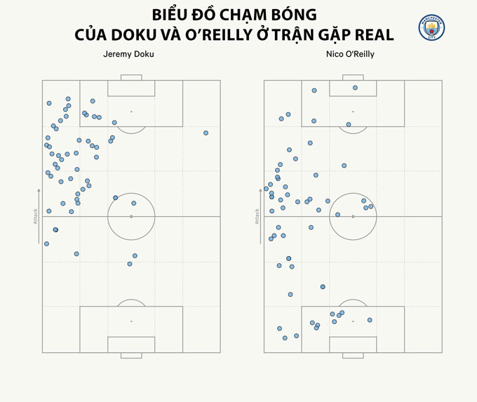 Man City chỉ thực hiện 27% số pha chạm bóng tấn công bên cánh trái trong hiệp một, thấp nhất mùa này. Pep Guardiola cố tình “đánh lạc hướng” Real bằng việc tập trung triển khai bên phải, rồi bất ngờ chuyển hướng sang trái khi Doku hoặc O’Reilly đã sẵn sàng. Mỗi lần trái bóng được mở sang biên trái, Doku và O’Reilly lập tức hoán đổi vị trí, tạo ra những tam giác tấn công khiến hàng thủ Real Madrid rối loạn.