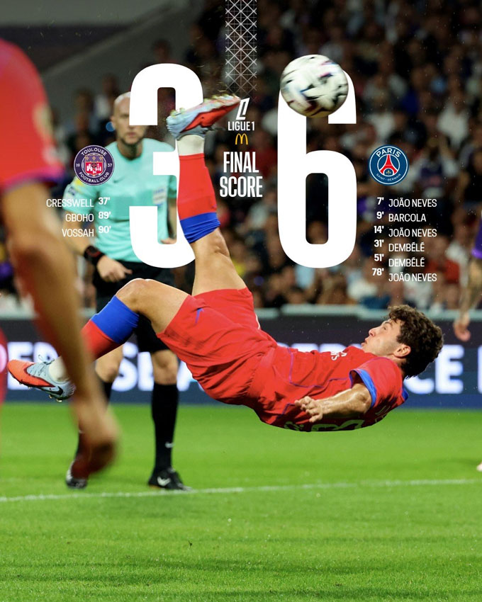 Làm khách trên sân của Toulouse tại vòng 3 Ligue 1, PSG không ngần ngại dâng cao tấn công ngay từ những phút đầu và sớm có được 4 bàn thắng chỉ sau 31 phút thi đấu. Trong đó, Joao Neves lập cú đúp còn 2 bàn còn lại thuộc về Barcola và Dembele (pen).