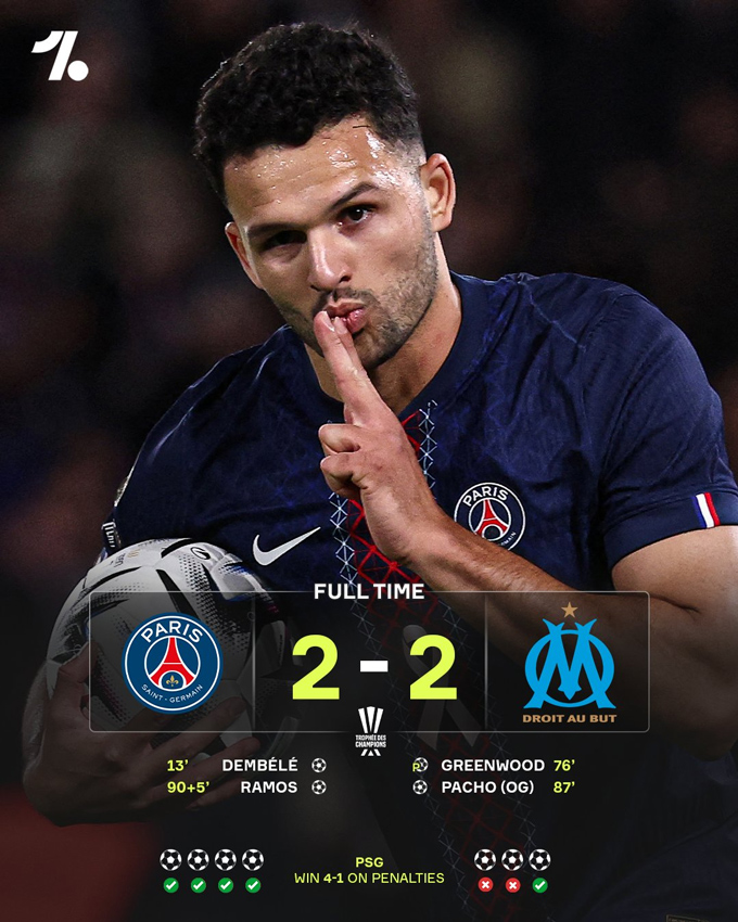 Phút 87 trung vệ Pacho bên phía PSG đá phản lưới, giúp Marseille vươn lên dẫn 2-1. Nhưng PSG không dễ gì để Marseille được hưởng niềm vui. Phút 90+5, Ramos tung ra cú vô lê tuyệt vời, gỡ hòa 2-2 và khiến trận đấu phải bước vào loạt luân lưu định mệnh.